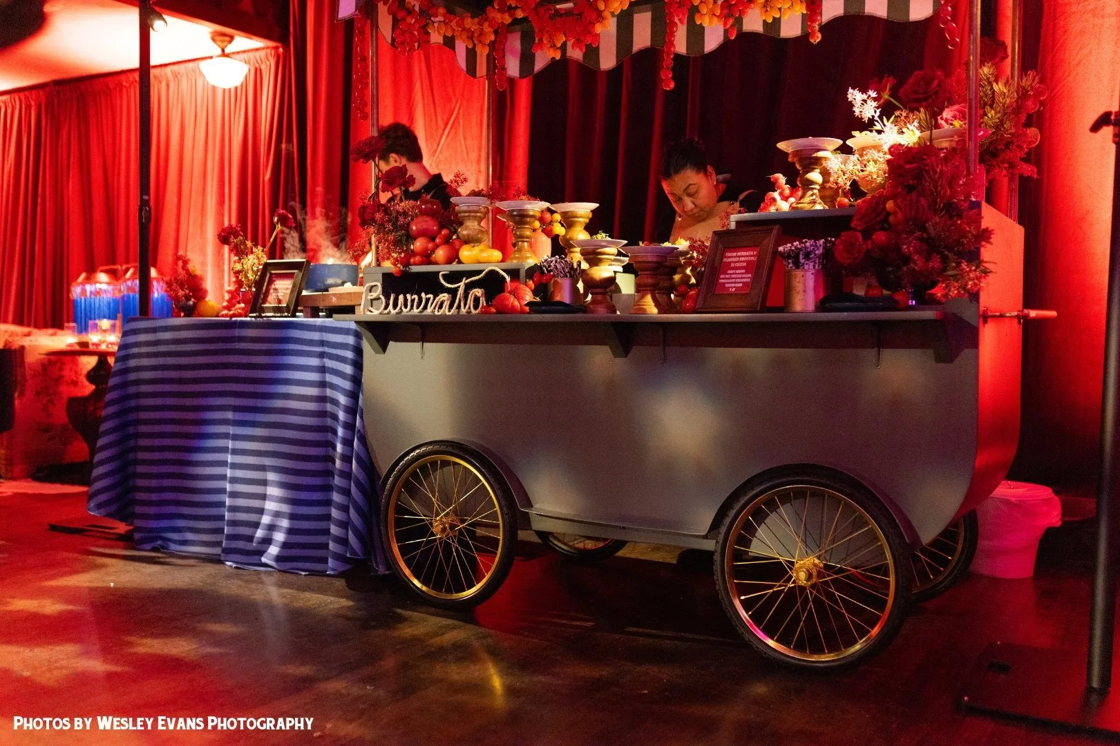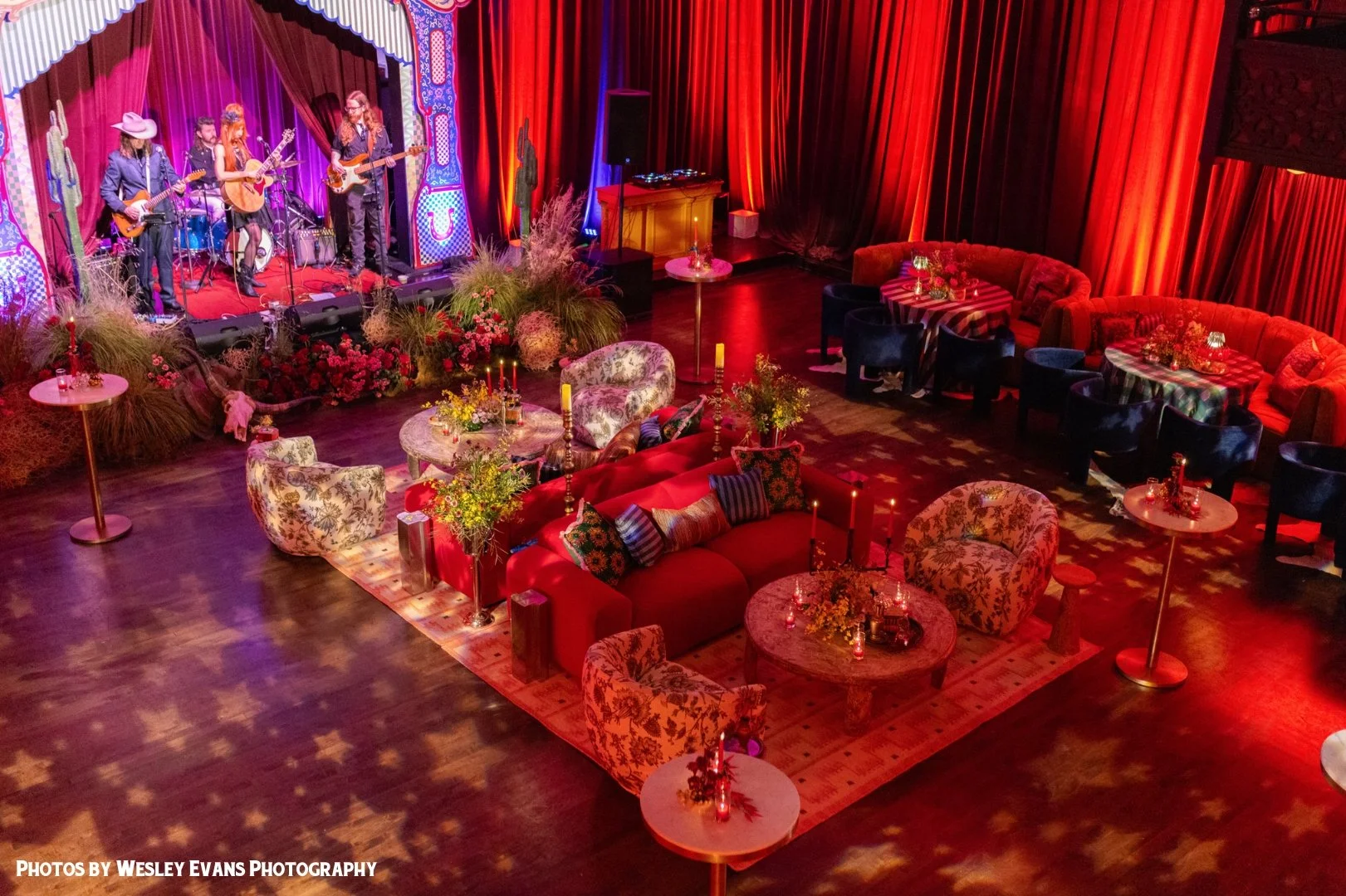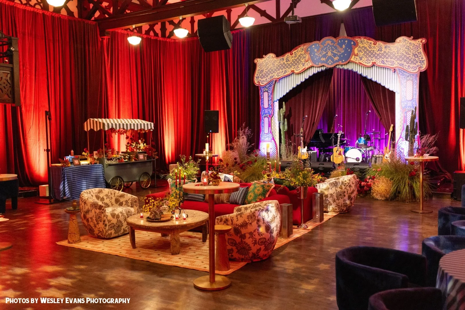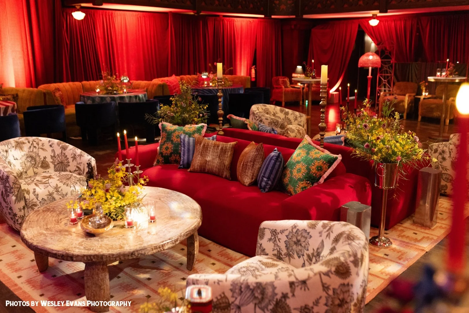 Draped in rich crimson curtains and glowing with warm candlelight, our space transformed into a dramatic winter escape in the heart of foggy San Francisco.