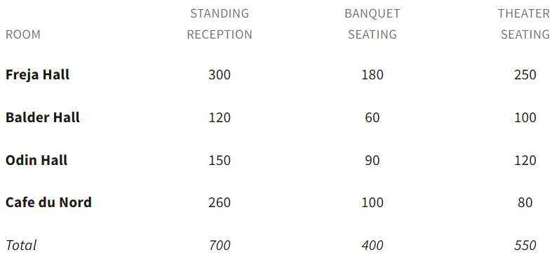 Maximum guest count will be determined by the event flow and room layout. Banquet seating is based on 60” round tables seating 10 people per table. Our venue can accommodate up to 700 guests. However, due to fire marshall restrictions, total guest counts may vary based on event setup, furniture, etc.